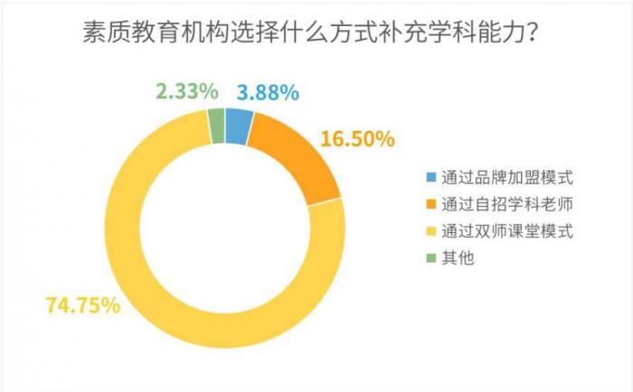 受机构本身专业能力、师资水平限制,在计划引入学科项目的素质教育机构中,16.5%的机构计划重新招聘老师,74.75%的机构选择通过双师模式补足学科短板。