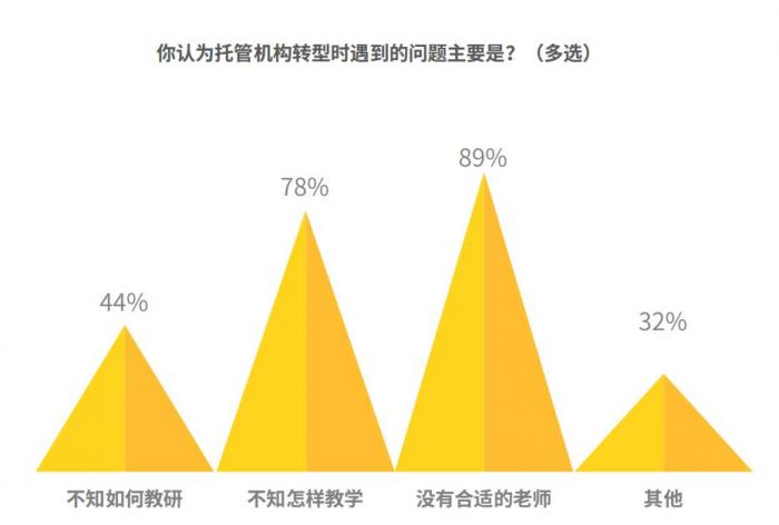 调研数据显示,托管机构转型过程中面临的困难主要有:不知如何教研(44%)、不知怎样教学(78%)、没有合适的老师(89%)、其他(32%)。