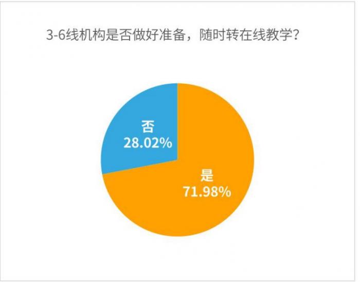 报告指出,疫情防控常态化下,不少线下教培机构除了正常开展线下课,也会提前做好疫情来袭转线上课的准备。调研数据显示,3-6线城市中,约有72%的机构校长在今年疫情前,就已做好随时转线上的准备。