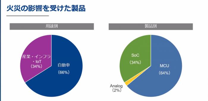 对于火灾波及的终端芯片,据介绍,66%为汽车用芯片,34%为基础设施、IoT芯片;若按芯片类型分,64%为MCU,34%为SoC,2%为Analog。尽管瑞萨电子在朝着1个月内恢复生产的目标努力,但是恢复到原先同等产能可能需要更长时间。瑞萨电子表示,包括半成品在内,还有一个月左右的库存。