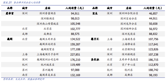 头部品牌在主要城市的门店总数也并不多,而且在不同区域的物业质素也有所不同,导致价格定位不一样。根据大众点评的统计,五大品牌的大多数门店人均消费在10万元以上,部分较高端的门店人均消费接近20万元。