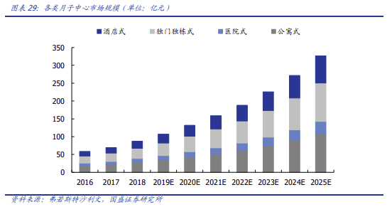 不同月子中心在经营场所有较大的差异。月子中心主要分为酒店式、公寓式、独栋别墅式、医院附属式四大类,经营上有各自的优劣势。医院附属式月子中心背靠医院的医疗实力,整体服务人员专业性最强,但是也由于优质医院毕竟是稀缺资源,所以医院附属式的供给有限,难以提升整体市场占比。酒店式月子中心因为消防等证照齐全,投入商业运营的改造成本低,也不需要投入太多装修成本重新改造房间,劣势是租金成本难以控制,且公共区域人员混杂。公寓式比酒店式的开办成本高,但是单栋中开设的房间较多,有利于规模化管理,投资回报更可控。而独栋别墅式月子中心私密性强,一般定位超高端,形象突出,容易形成品牌效应,缺点是前期投入大,投资回报期长。根据弗若斯特沙利文预测,医院式、酒店式、公寓式和独栋别墅式月子中心2019至2025年复合增长率分别为18.6%、20.4%,20.9%和20.6%。