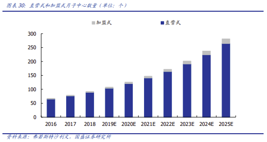 按照经营模式,直营式的月子中心市场份额占比要远高于加盟模式,很重要的原因是目前品牌力强的月子中心主要是区域品牌,还不具备全国号召力,无法对加盟店起背书作用。另外,品牌直营模式能更好控制服务质素,形成长期的品牌沉淀。根据弗若斯特沙利文预测,直营式和加盟式2019到2025年复合增长率分别为16.9%和24.1%,从长远来看要较加盟模式更具生命力,未来仍会主导市场。