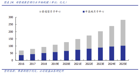 月子中心市场潜力巨大,高品质服务更受青睐。月子中心与传统的月嫂服务相比较而言更加专业更具科学依据,商业模式具有强大的生命力。根据弗若斯特沙利文预测,2018年月子中心的市场规模为92.5亿元,高端市场规模41亿元。随着国家二胎政策放松,一线城市消费水平及月子服务需求提高,越来越多家庭条件较富裕的孕产妇选择在月子中心坐月子,高品质月子中心将持续供不应求。