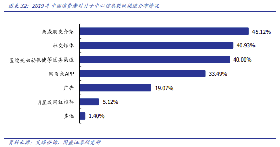 2019年,中国消费者获取月子中心相关信息的最主要途径是亲戚朋友的介绍,其次是社交媒体,医院或妇幼保健等医务渠道,以及网页或APP的渠道;说明了当前对月子中心来说,医务渠道、口碑相传、网络渠道是比较有效的宣传模式,而商业广告、品牌合作等其他营销方式可作为补充渠道。