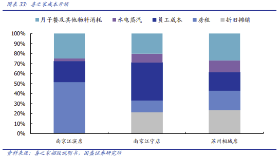 月子中心经营商大多并不持有物业,而只是与酒店、公寓或者独栋别墅房东签署租赁协议。光从开办费用来看,一个80个房间的新项目大约需要投资4000-5000万资本开支,档次越高的月子中心,装修需要更好一些,以突显专业形象。即使是同一个品牌内,各家门店的经营场地和硬件设备条件不一样,所以成本构成有较大差异,进而影响投资回报率。总的来看,场地租金、设备折旧等固定开支占月子中心营业成本的30%-50%,月子餐及物料成本、员工成本和水电蒸汽等浮动成本占营业成本50%-70%。