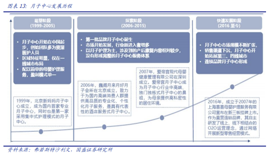 上世纪90年代开始,聘请月嫂照顾宝宝就已经开始成为了大城市年轻父母纾解育儿压力的解决方案,主要照顾的对象还是初生儿。其后到了1999年,全国第一家月子中心北京新妈妈月子中心成立,标志着行业开始萌芽。2006-2015年是行业的探索阶段,新进入者越来越多,但是行业还没有形成完整的月子中心服务体系。2016年以后,行业进入快速发展阶段,市场规模不断扩张,销售渠道开始下沉到3、4线城市,连锁品牌的月子中心出现。