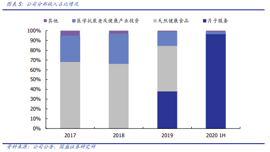 2019年,上市公司整体收入6.1亿港元,其中并表了爱帝宫带来了2.3亿港元收入,另外天然健康食品业务贡献收入2.8亿港元,医学抗衰老及健康产业投资业务贡献0.86亿港元收入。截至2020年上半年,公司剥离天然健康食品分部及国内生命抗衰老业务,业务战线收缩聚焦主营,营业收入达到3.24亿港元,其中月子服务单项业务贡献3.13亿港元。