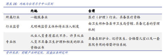 生活习惯相近的台湾地区,月子中心行业同样萌芽于20世纪90年代,目前月子中心渗透率已经高达60%,远高于大陆地区约6%的水平。台北市卫生局早在2001年制定了《产后照顾机构辅导条例》,规定月子中心成立时必须向政府申请立案,而且卫生部每年组织专家通过实地查访的方式对月子中心进行评鉴定级,行业规范化也是促进行业渗透率提升的重要原因。反观大陆地区,从中央到地方目前仍没有完善的法规监管和准入制度监督月子中心行业,行业参与者素质参差。未来随着行业发展更加规范,消费者信心增强,月子中心的渗透率也会进一步上升,成长空间巨大。