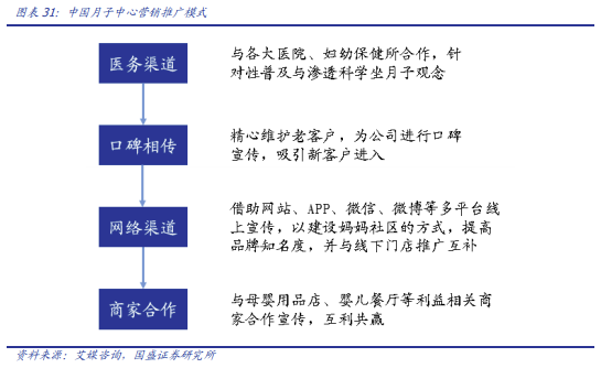 月子中心的营销推广模式主要分为四大类:1)医务渠道推广:月子中心与各大医院、妇幼保健机构进行合作,针对性地向潜在消费者普及与渗透科学坐月子的观念;2)口碑相传:月子中心通过服务好老客户,使其为企业或品牌进行口碑宣传,从而吸引新客户进入;3)网络渠道:月子中心借助网站、APP、微信、微博等多平台进行线上宣传,以建设妈妈社区的方式,提高品牌知名度,并于线下门店推广互补;4)商家合作:月子中心与母婴用品店、婴儿餐厅等利益相关商家进行合作宣传,从而实现互利共赢的推广方式。