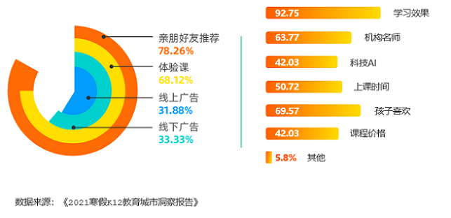 学习效果、孩子喜欢、机构名师是影响家长报课选择的前三大要素,品牌广告对下沉市场家长影响不明显,爱学习调研数据显示,78.26%的家长从亲朋好友推荐了解课外辅导机构,他们更看重辅导机构的学习效果。