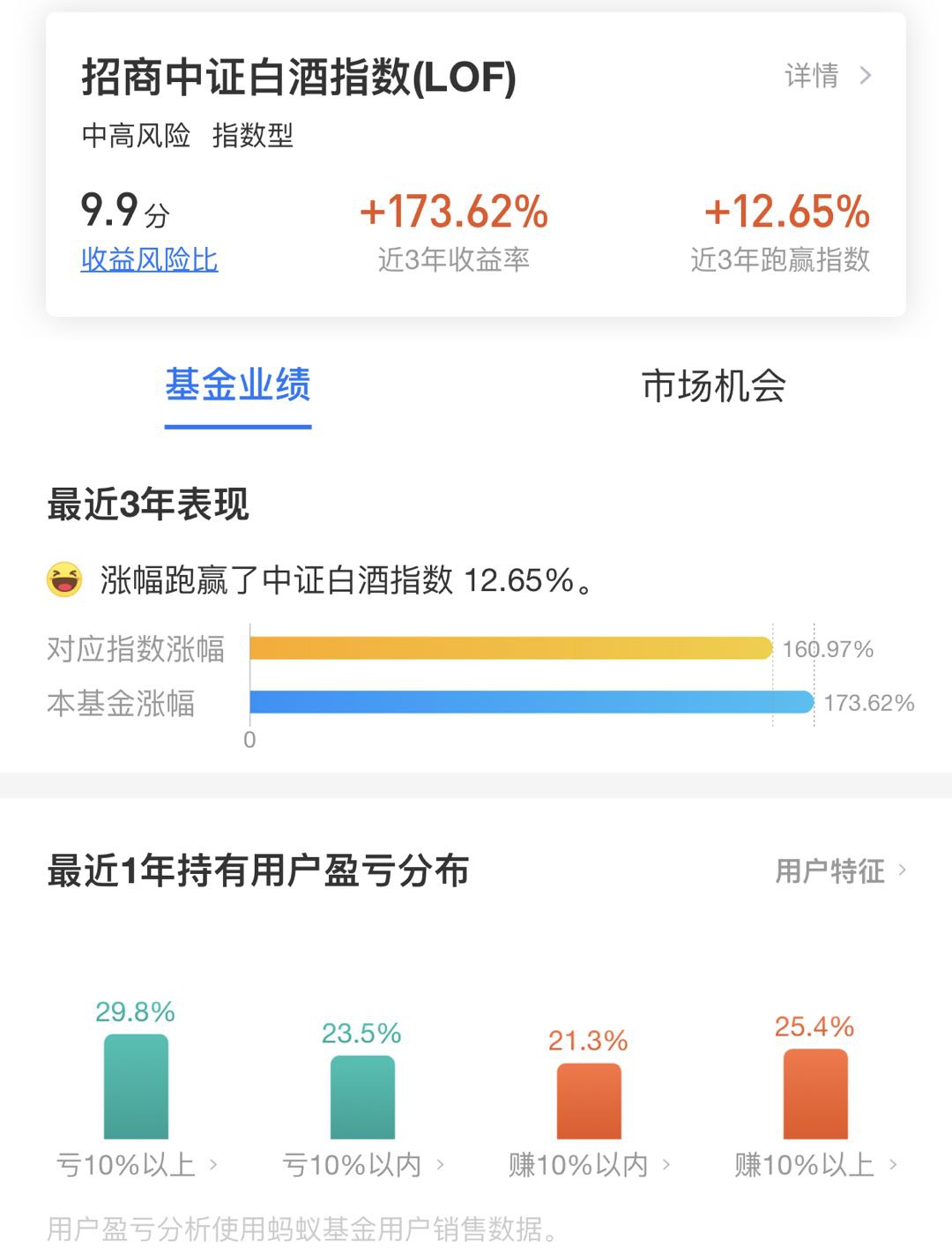 招商中证白酒指数基金堪称基金界的“网红”,去年以来霸屏支付宝基金热购榜,2020年三季度末该基金规模突破200亿元。截至今年1月8日,规模已飙升至568.47亿元,持有人户数也高达830.76万户。从近一年持有用户盈亏情况来看,超半数投资者是亏损的,其中,29.8%的投资者亏损幅度超过10%,而招商中证白酒指数近一年涨幅达117.86%。