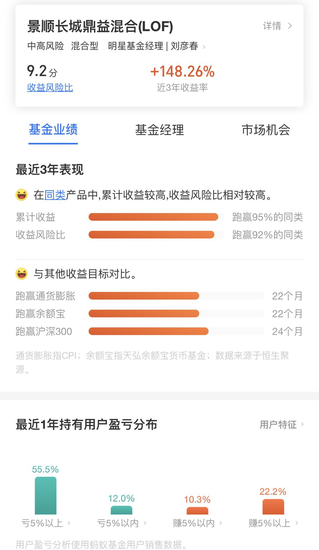 再来看看刘彦春的景顺长城鼎益,数据显示,最近1年有55.5%的用户亏损在5%以上,12%的用户亏损在5%以内,赚5%以内和5%以上的占比分别为10.3%和22.2%。