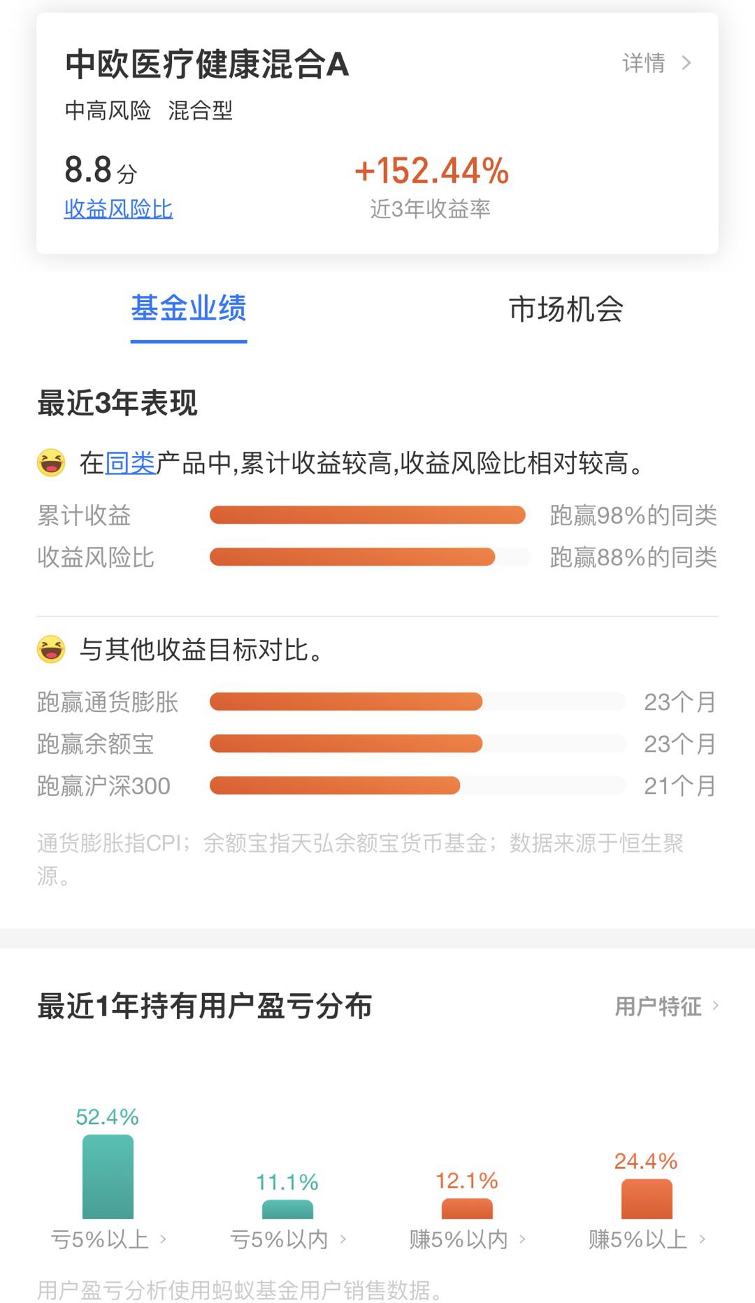数据显示,从近一年持有用户盈亏分布来看,盈利的客户占比36.5%,52.4%的投资者亏损超过5%。但从基金本身收益来看,中欧医疗健康混合A近一年收益率超过70%。放弃定投和追涨杀跌仍然是投资者亏钱的主要原因。