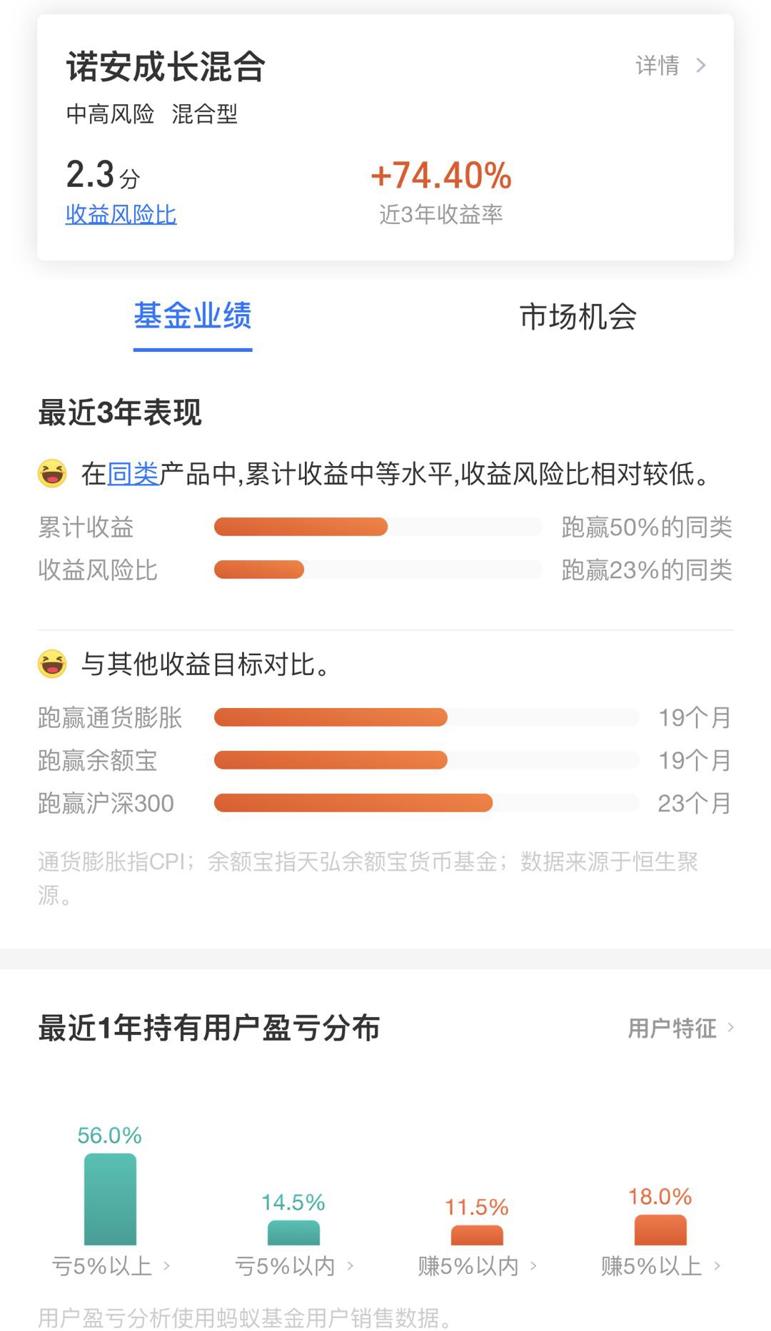 从近一年持有用户盈亏情况来看,只有不到三成投资者实现盈利,56%的投资者亏损超过5%。不过,诺安成长近一年的表现并不如人意,截至3月21日,基金净值涨幅为11.47%。