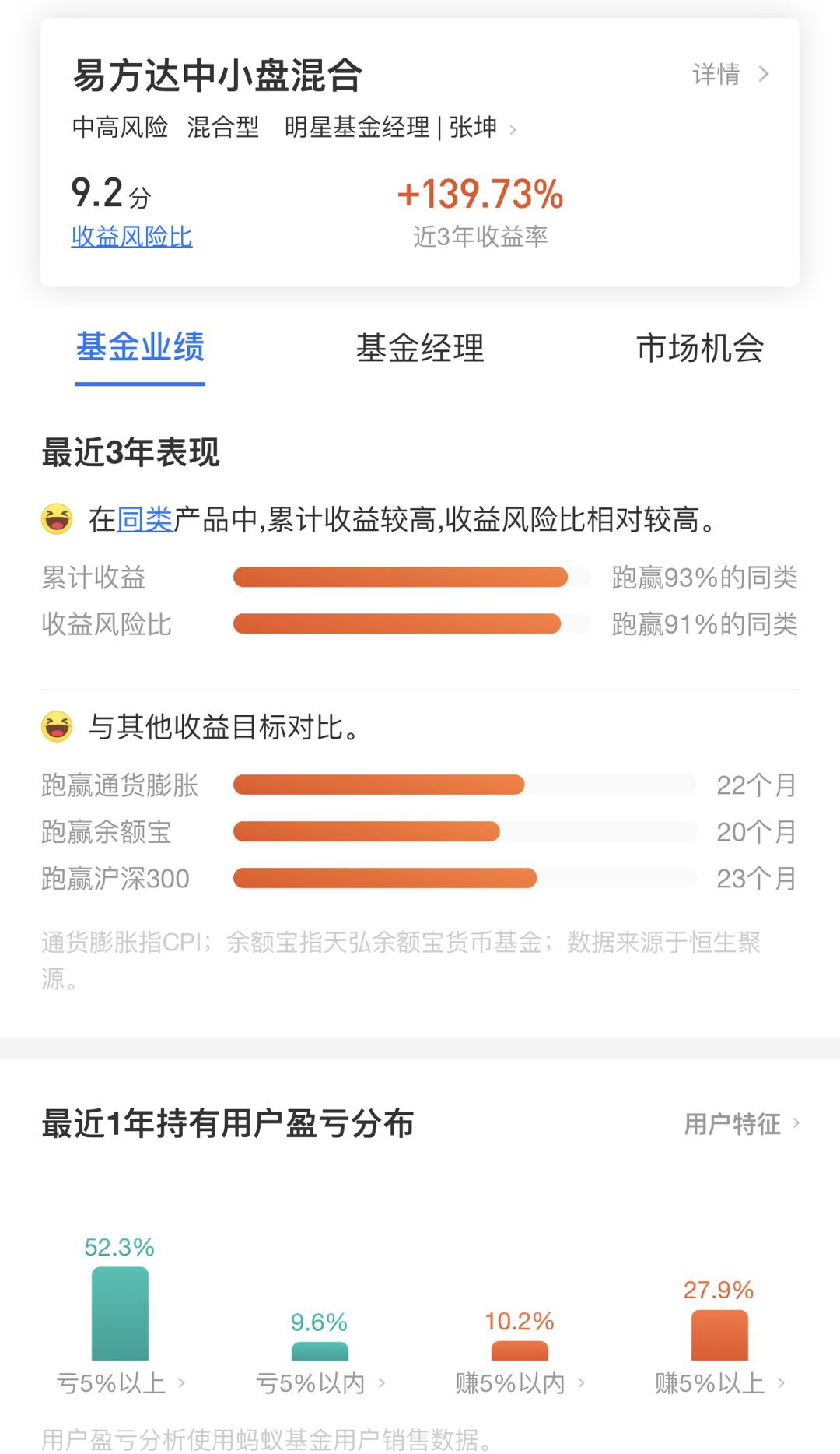 张坤是公募基金行业首位管理规模超过1000亿元的主动权益基金经理,今年以来频频登上热搜,甚至有了自己的粉丝后援会。除了易方达蓝筹精选外,张坤管理的另一只明星产品——易方达中小盘混合的持有人盈亏情况也较为惨淡。