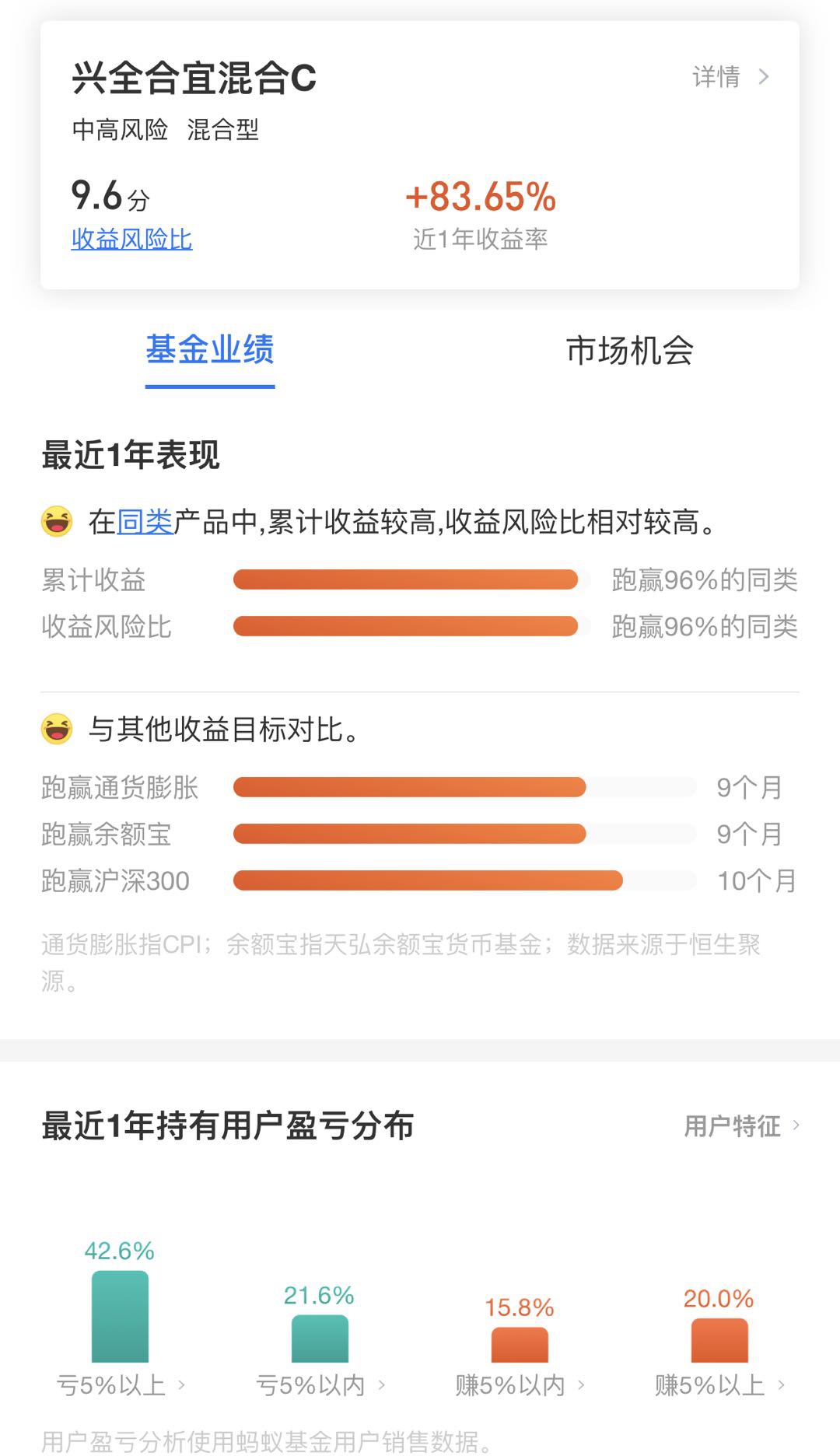 还有谢治宇的兴全合宜C,数据显示,最近1年42.6%的持有用户亏损在5%以上,21.6%的用户亏损在5%以内,赚5%以内和5%以上的用户占比分别为15.8%和20%。