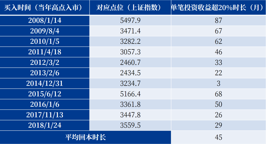 具体来看,如果在2008年的阶段性高点即上证指数5497.9点(也即近10年上证指数最高点位)买入,截至今年3月8日,不考虑申赎费管理费等费用,这笔投资回本需要86个月;2015年上证指数再次冲上5000点,如果在当年的5166.4点最高点买入,这笔投资回本时间大概需要61个月。数据显示,在单笔投资的情况下,在2008年-2018年的最高点买入,只要愿意长期持有最后总会回本,只是回本时间有长有短,平均回本时长为25个月。