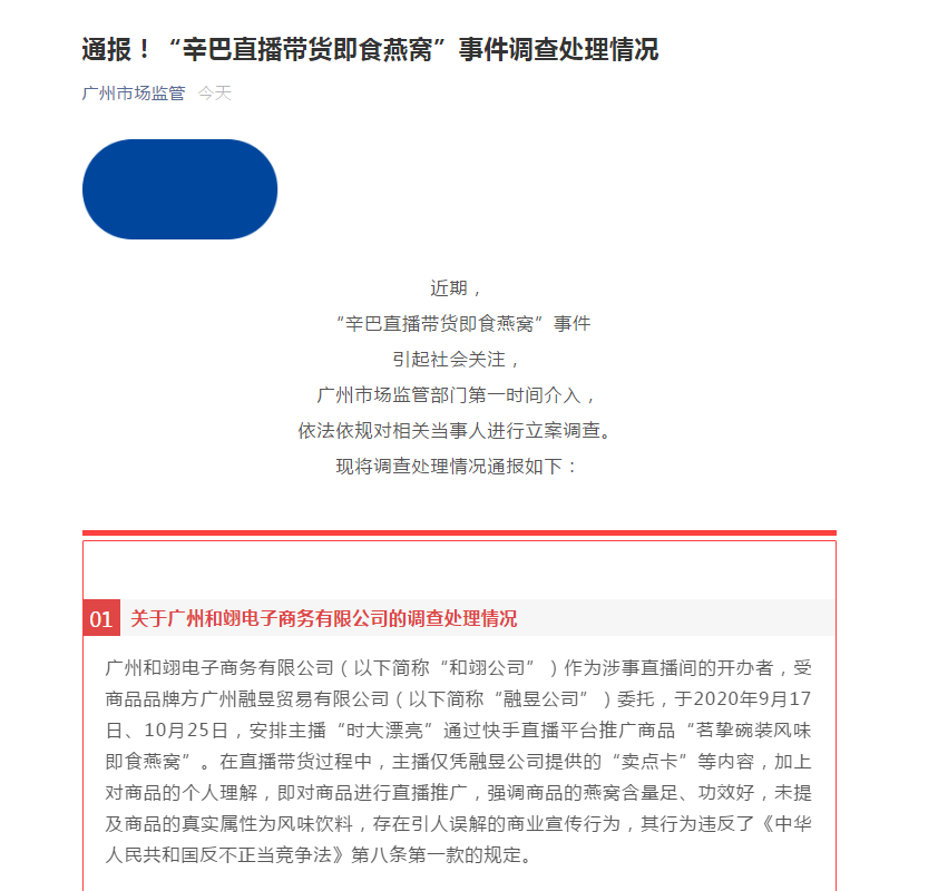 "辛巴直播带货即食燕窝"事件调查处理情况:涉事公司罚款290万元