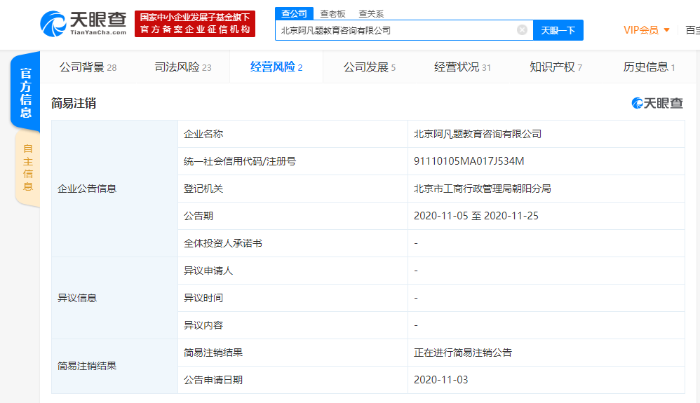 原标题:“阿凡题搜题”关联公司申请简易注销,曾因涉及推送导向不良和低俗信息被相关部门予以处罚11月10日消...