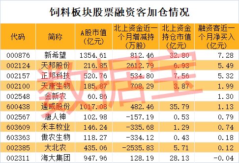 北上资金和融资客的目光也早已关注到饲料板块。数据显示,近一个月来,北上资金增持天邦股份、新希望、天康生物、正邦科技、通威股份、海大集团等股超过百万股,其中天邦股份获增持最多,达到2613万股,北上资金持仓市值达到6.93亿元。融资客超亿元加仓的也有6只,分别是新希望、天邦股份、正邦科技、天康生物、金新农、通威股份。新希望获融资客净买入额7.28亿元居首,最新融资余额达到52.21亿元。