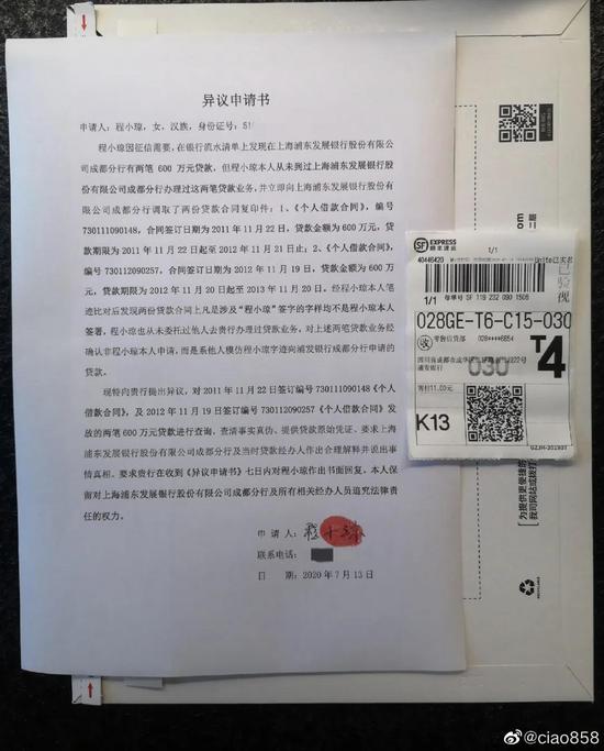 关于这两笔贷款,程小琼仍有诸多疑问。她希望银行提供原始审批文件查阅,并向浦发银行申请提取贷款合同原件做笔迹鉴定,但对方以各种理由拖延时间。目前她已向四川省银保监局寄送了相关投诉材料。