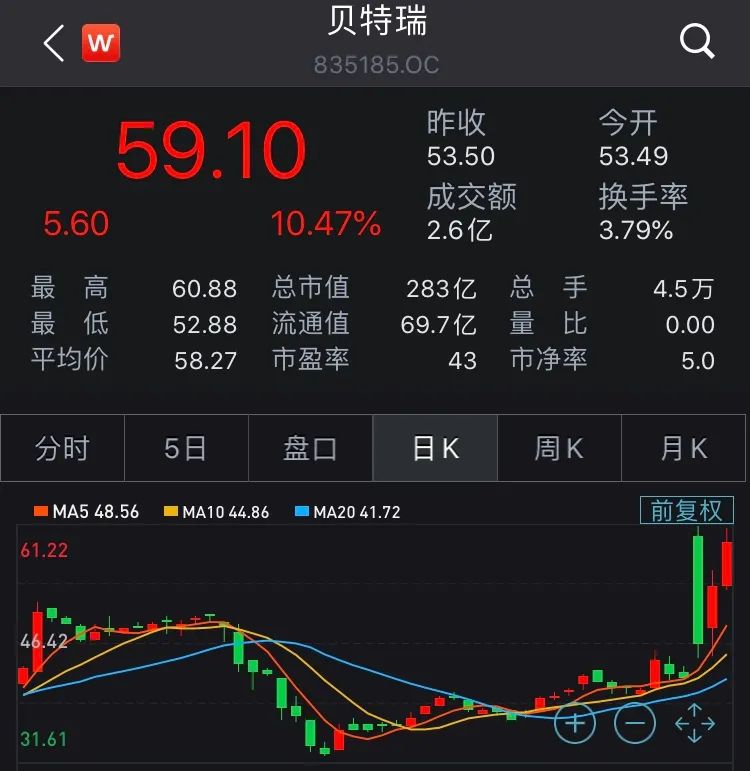 更有数只股票开市后连续上涨。比如贝特瑞,首日上涨10.43%,次日上涨15.90%,今日早盘上涨10.47%,最新股价为59.10元/股,较发行价上涨41.39%。公司最新总市值为283亿元,精选层“市值一哥”地位稳固。