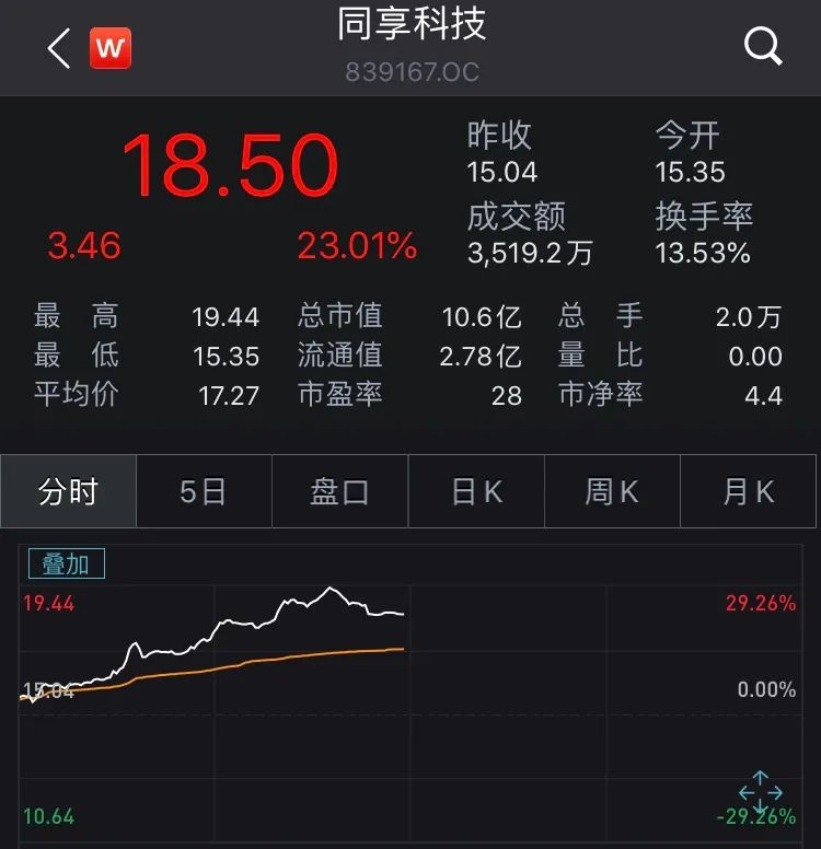 分时走势图显示,同享科技盘中一度接近涨停,最高上涨29.26%。根据规定,成交首日除外,精选层股票全时段实施价格涨跌幅限制,限制范围是前收盘的上下30%。这只股票上市首日大涨55.40%,次日下跌4.93%。公司最新收盘价为18.50元/股,较发行价上涨81.73%。