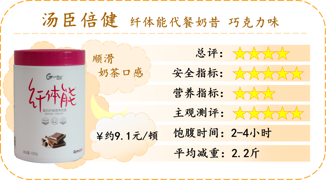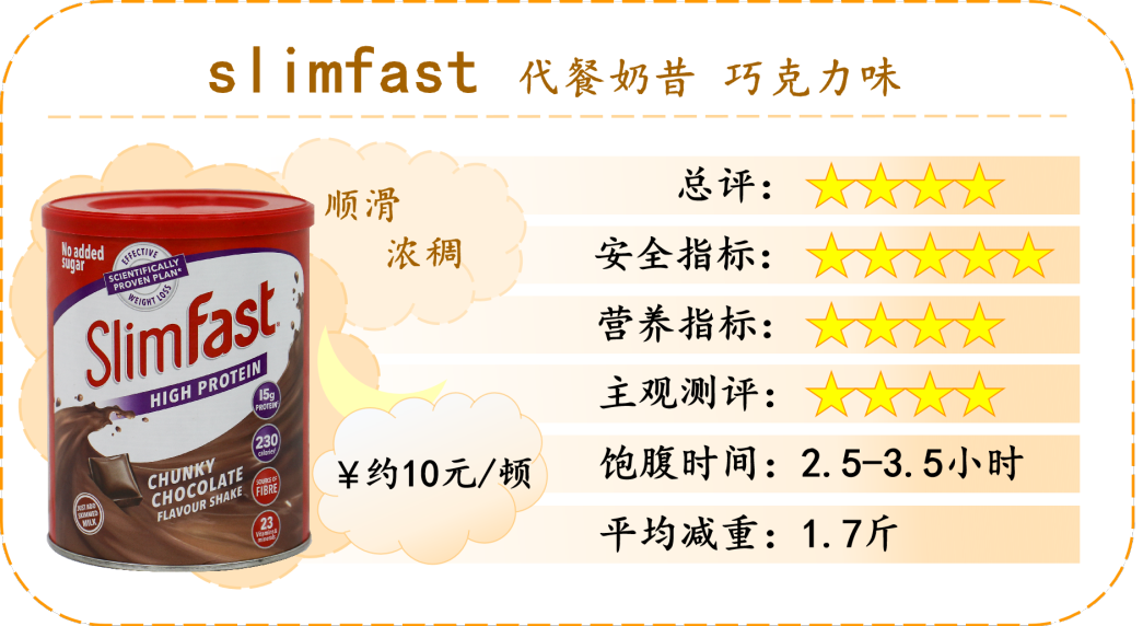 ●slimfast代餐奶昔(巧克力口味)能量和总膳食纤维均偏低。