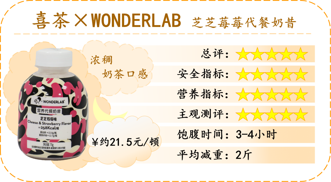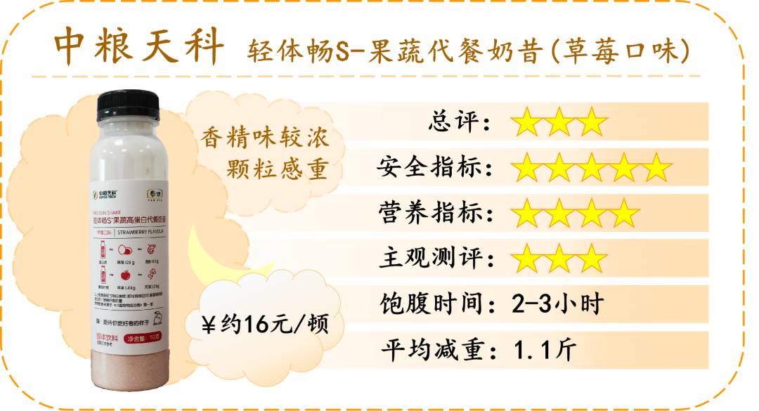 ●中粮天科轻体畅S-果蔬高蛋白代餐奶昔(草莓口味)能量偏低。