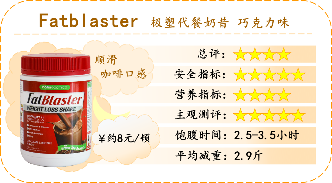●Fatlaster极塑代餐奶昔(巧克力味)能量、蛋白质偏低,总膳食纤维些许偏高。