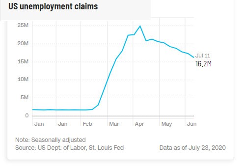 例如,虽然美国在5月和6月增加了惊人的750万个工作岗位,但自2月以来仍然减少了近1500万个工作岗位。上图显示,截至7月11日,美国续请失业金人数超过1600万人次。