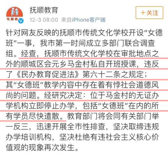 2017年,辽宁抚顺“女德班”事件引发网友的强烈关注。最终,当地教育部门出面要求有关机构立即关停“女德班”,并遣散学员。
