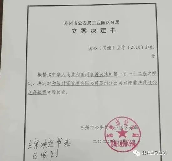 和信贷线下财富端平台和信财富也被立案调查。苏州市公安局工业园区分局出具的立案决定书显示,“对和信财富管理有限公司苏州分公司涉嫌非法吸收公众存款案立案侦查。”