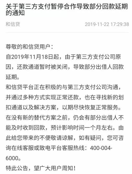 其实,和信贷相关业务出现问题已经由来已久。早在2019年11月12日,和信贷曾以站内消息形式向部分出借人发布通告称,自2019年11月18日起,由于第三方支付公司原因,还款通道暂时被关闭,导致部分出借人回款延期,预计影响时间一个月左右。