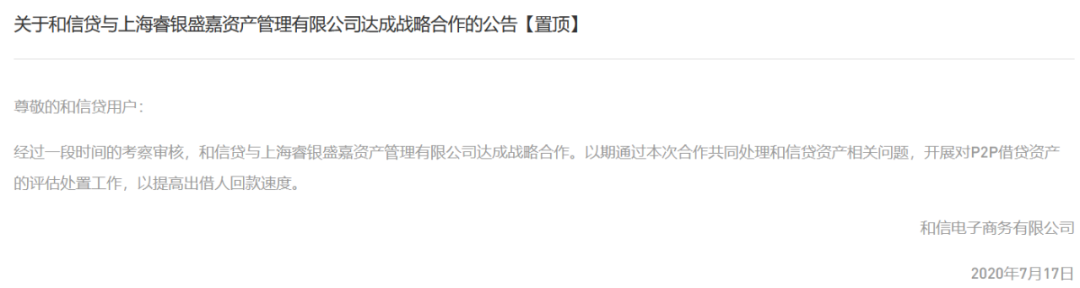 近日,针对出借人回款慢、回款难等问题,和信贷官网对外公告,称与上海睿银盛嘉资产管理有限公司达成战略合作。通过合作,后者将共同处理和信贷资产相关问题,开展对P2P借贷资产的评估处置工作,以提高出借人回款速度。