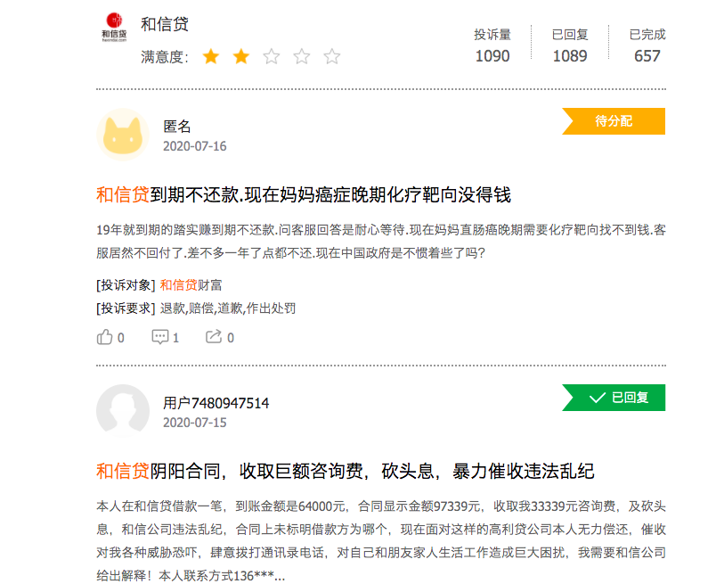 在黑猫投诉网站上,涉及和信贷的投诉共有1090条,其中多数内容涉及到期不还款、阴阳合同、暴力催收等事项。还有客户表示:“2018年5000元理财到期,2018年10月12日23点申请退出,至今无法提现。与客服联系就是耐心等待,之后被拉黑。”