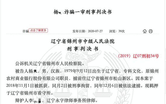 判决书显示,被告人杨某,男,1979年9月12日出生于辽宁省,原锦州农村商业银行股份有限公司职员。
