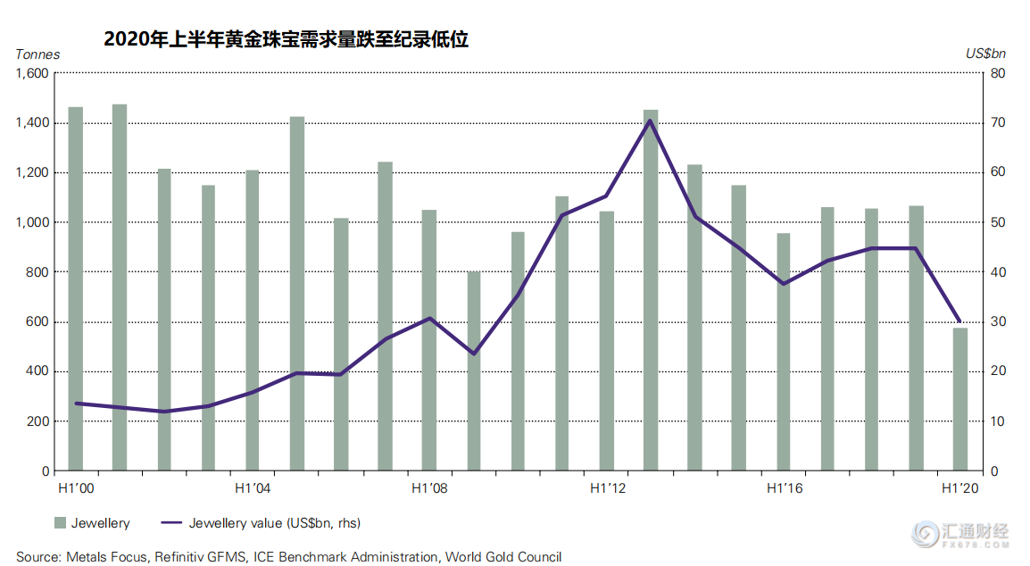 全球金矿生产与黄金回收受到因为应对疫情而采取的封锁措施的影响,上半年的黄金总供应量同比下降6%,至2192吨。