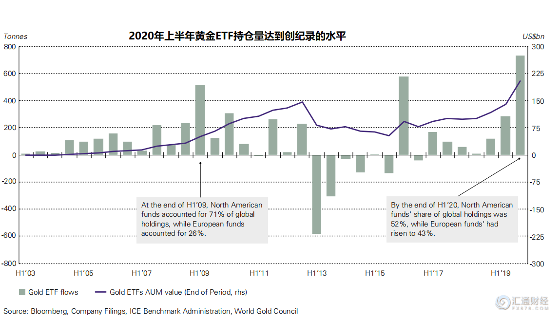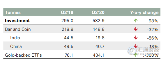 2020年上半年黄金的投资需求创历史新高至1130.7吨,且持仓总值也达到创纪录的水平至600亿美元,包括黄金ETF以及金币和金条的投资。