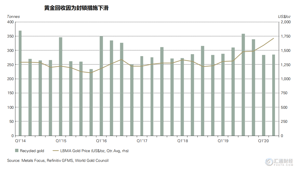 在美国,持续的高感染率,特别是在纽约和洛杉矶的主要回收中心,意味着回收活动大大低于正常水平。同样,在中东,封锁导致该地区回收的黄金逐年减少。在感染率特别高的伊朗,消费者不愿离开自己的家,导致黄金回收的减少。有趣的是,在土耳其,对金价进一步上涨的预期也是影响消费者不再大量回收黄金的一个因素。
