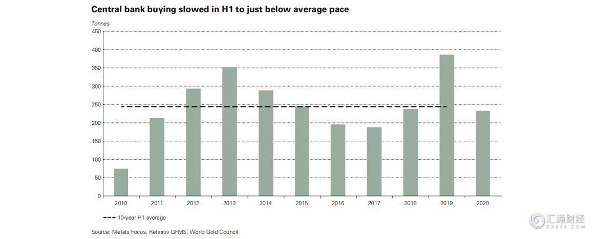 2020年上半年,全球央行黄金需求达到233吨,尽管央行购买的步伐从2019年创纪录的水平明显放缓。全球央行净购买总额在2020年上半年为233吨,同比下降39%。但是由于需求量仍然强劲,这比央行上半年黄金购买量的十年平均水平247吨只低6%,当时各国央行成为了黄金的年度净买家。