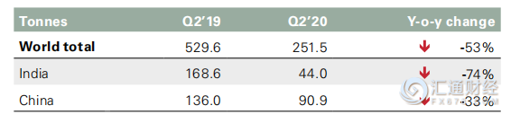 其他工业和牙科应用分别录得33%和30%的大幅度下降,分别为8.4吨和2.6吨。这主要是世界各地实行封锁的结果。最显著的影响发生在印度,在封锁期间,用于传统服装的金线需求暴跌,意大利用于奢侈配饰的镀盐产量也明显下降。