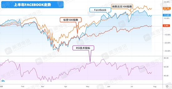 自5月中旬以来,Facebook股价一直在220美元至245美元之间波动。Facebook在5月处于超买区间,但在6月的季度结果中,相对强弱指数或RSI为44,已跌至略超卖的位置。Facebook股价的一个关键技术面是,目前其收盘价(7月29日)低于50日移动平均线,这可能成为股价上涨的阻力;此外,100日和200日移动平均线分别为206美元和204美元,除非股价下跌10%,否则这些技术指标无法提供支撑。截至7月29日收盘,Facebook股价报233.29美元,今年累涨13.66%。