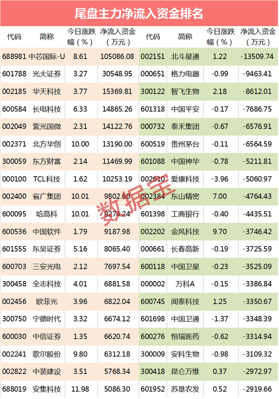 个股方面,尾盘有8只个股流入资金超亿元,中芯国际尾盘流入资金达10亿元,光大证券尾盘流入3亿元,华天科技、长电科技、紫光国微、北方华创、TCL科技等科技股尾盘资金流入超亿元。