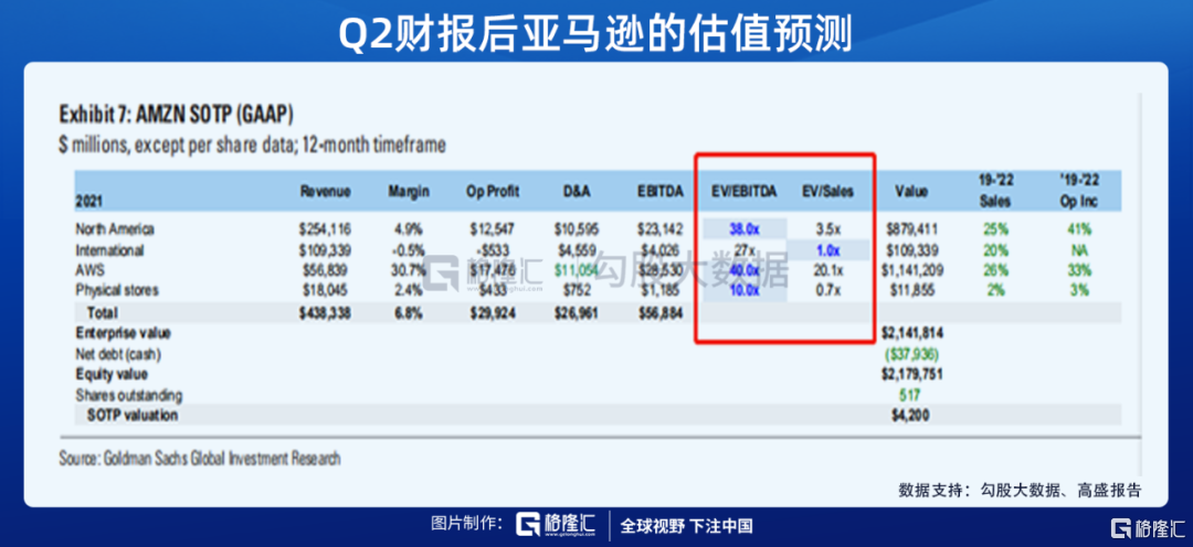 Q2业绩之后,高盛马上把目标3800美元上调到4200美元,其中北美零售38倍EV/EBITDA,AWS40倍EV/EBITDA。
