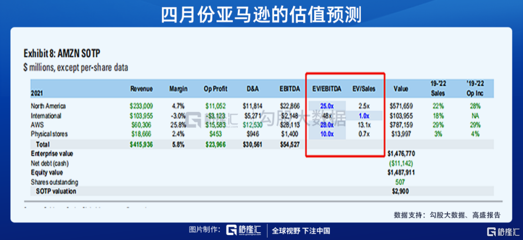 他们认为亚马逊值钱的业务有四块:北美零售,国际零售,云计算AWS以及实体店零售。四月份的时候,他们给北美零售25倍EV/EBITDA,AWS28倍的EV/EBITDA。