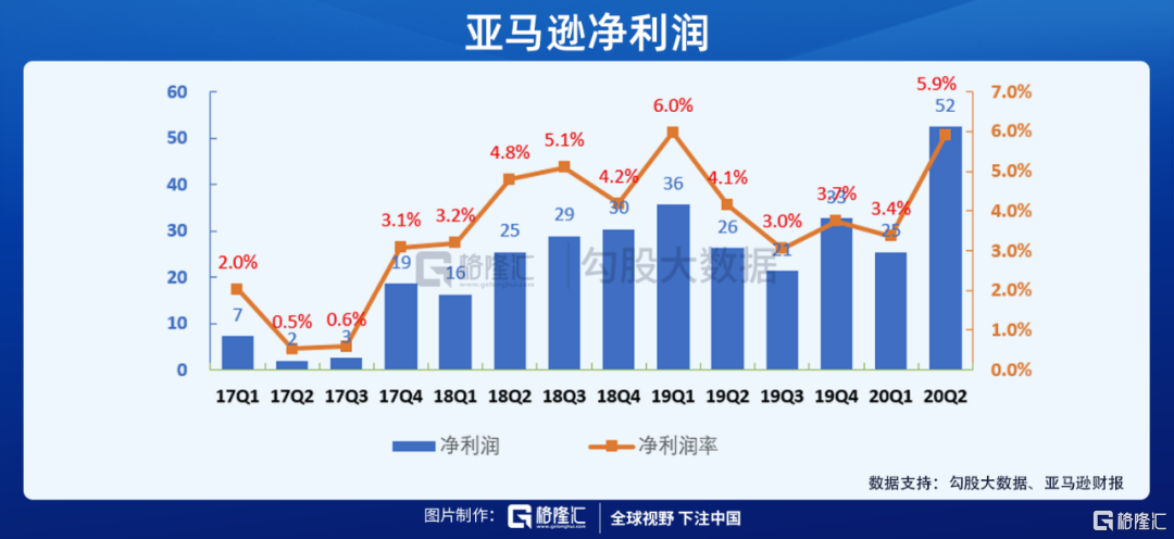 实际情况是,亚马逊二季度净利润同比增长99.7%至52亿美元。调整后每股收益(EPS)10.3美元,同比增长97.3%,市场预期1.38美元。去年同期5.22美元。