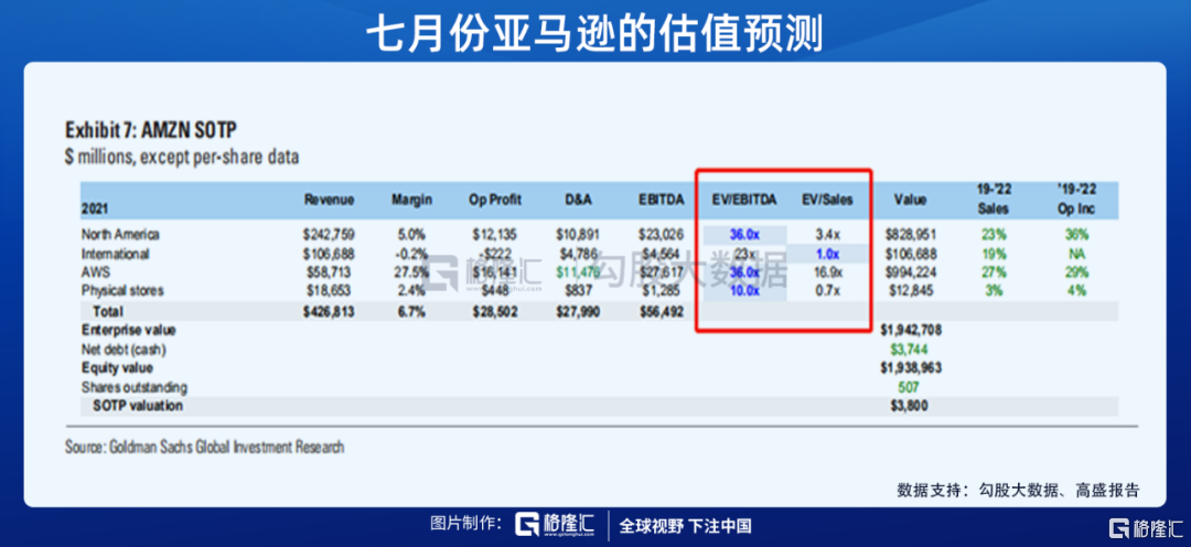 到了七月,他们认为北美零售应该值36倍EV/EBITDA,AWS应该值36倍的EV/EBITDA,直接把亚马逊2021年的目标价从2900美元打到3800美元。