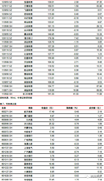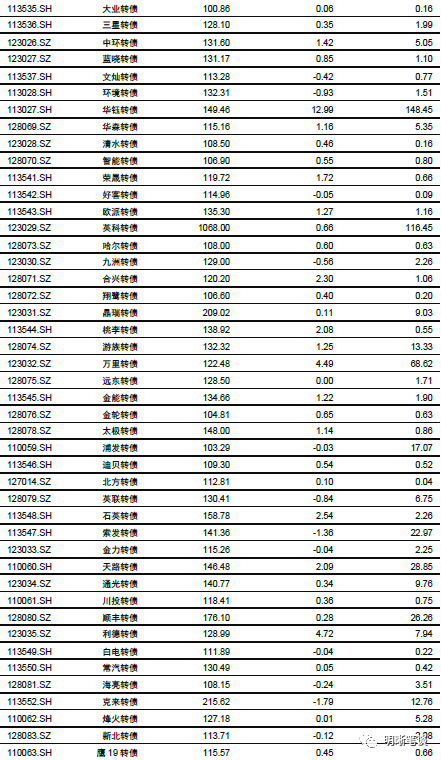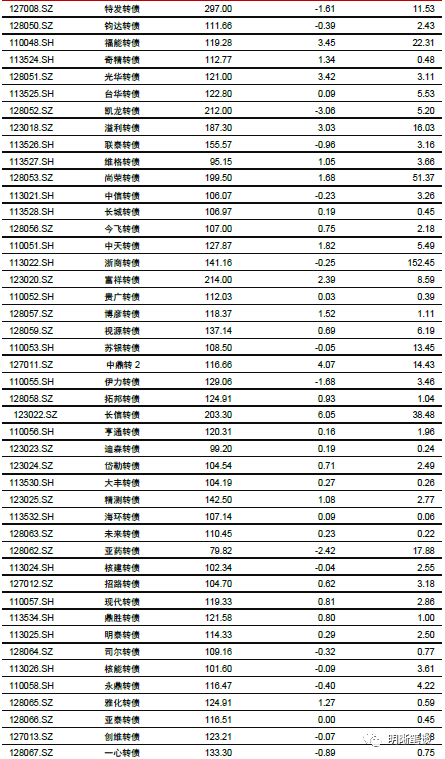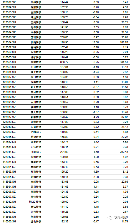 7月31日转债市场,中证转债指数收于369.13点,日上涨0.56%,等权可转债指数收于1,523.21点,日上涨1.04%,可转债预案指数收于1,257.90点,日上涨1.42%;平均平价为120.42元,日上涨1.36%,平均转债价格为134.99元,日上涨0.80%。281支上市可交易转债(辉丰转债除外),除铁汉转债、亚泰转债、纵横转债、顺昌转债和远东转债横盘外,190支上涨,86支下跌。其中,安20转债(41.33%)、湖盐转债(16.06%)和仙鹤转债(13.68%)领涨,机电转债(-3.87%)、金禾转债(-3.19%)和凯龙转债(-3.06%)领跌。279支可转债正股(*ST辉丰(维权)除外),除大胜达、凌钢股份、滨化股份、常熟汽饰、鼎胜新材、中信银行、联泰环保、凯中精密、太阳纸业、海印股份(维权)、铁汉生态和内蒙华电横盘外,189支上涨,78支下跌。其中天创时尚(10.04%)、龙蟠科技(10.02%)和天铁股份(10.01%)领涨,寒锐钴业(-5.05%)、宝通科技(-4.10%)和康隆达(-3.77%)领跌。